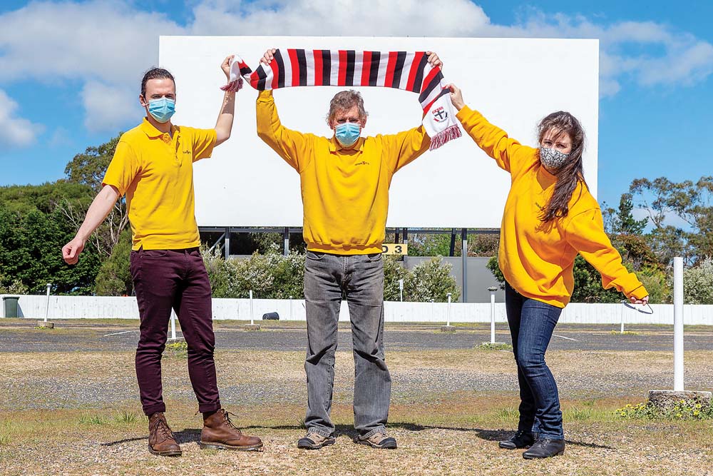 THE Saints won’t be marching in, but Dromana Drive-In’s Paul Whitaker, son Joshua Whitaker and wife Shelley are hopeful of being able to show the grand final on the big screen next week. Picture: Gary Sissons